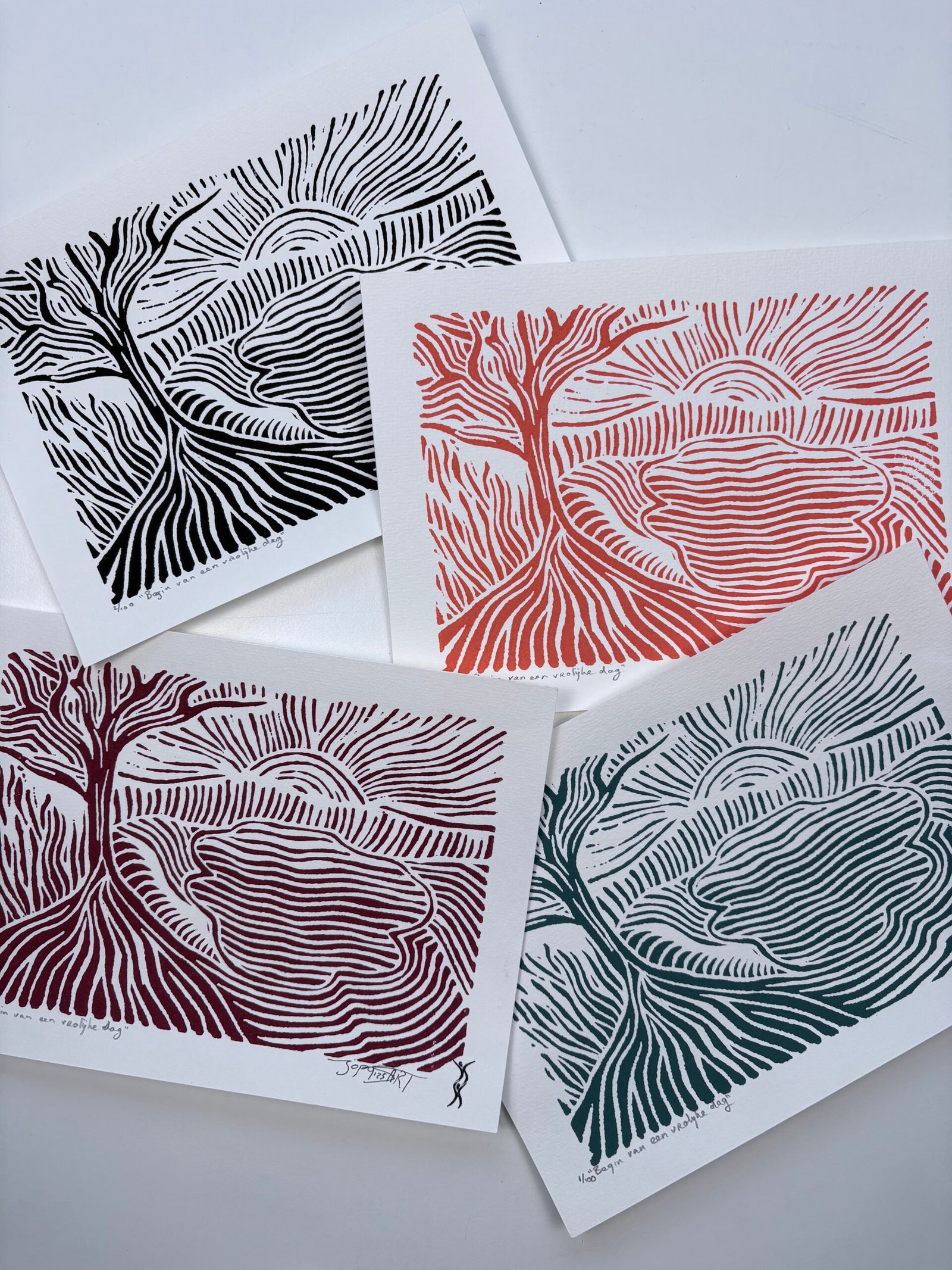 Elke print is handgedrukt. Hierdoor kunnen de prints onderling iets van elkaar verschillen. Dit hoort bij het drukken met de hand en maakt iedere linoprint uniek. Het geeft de print een eigen karakter.