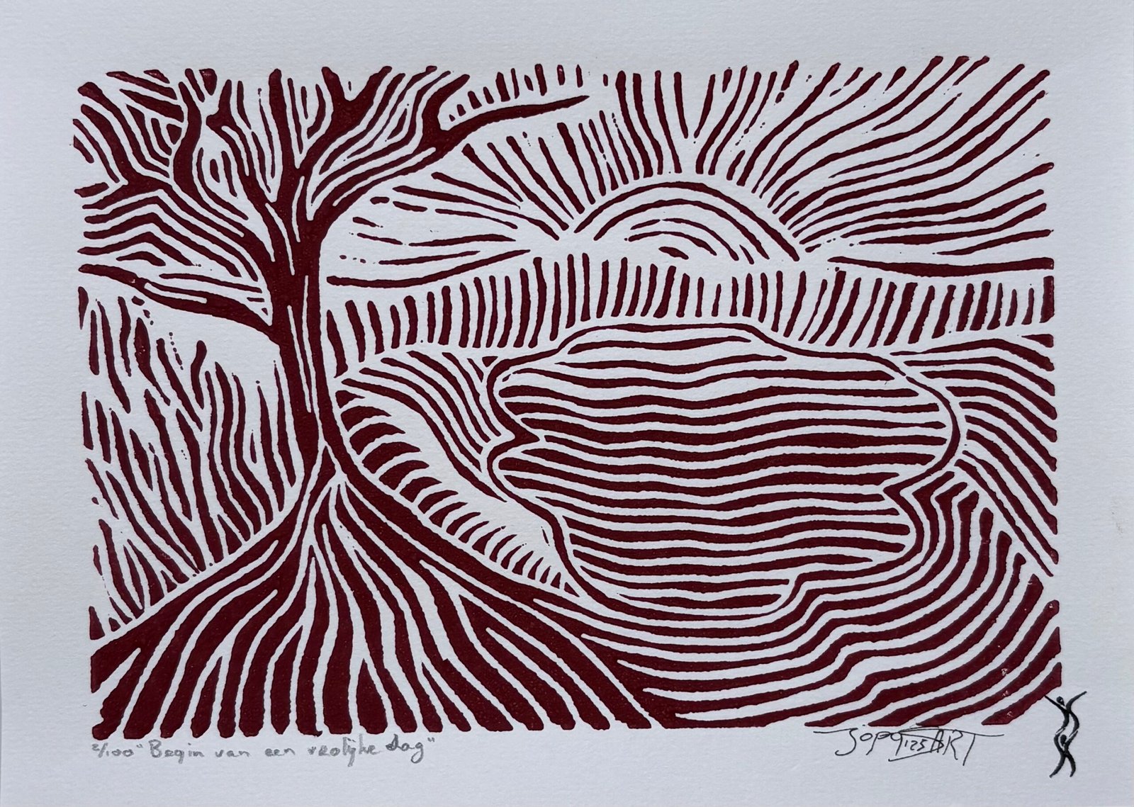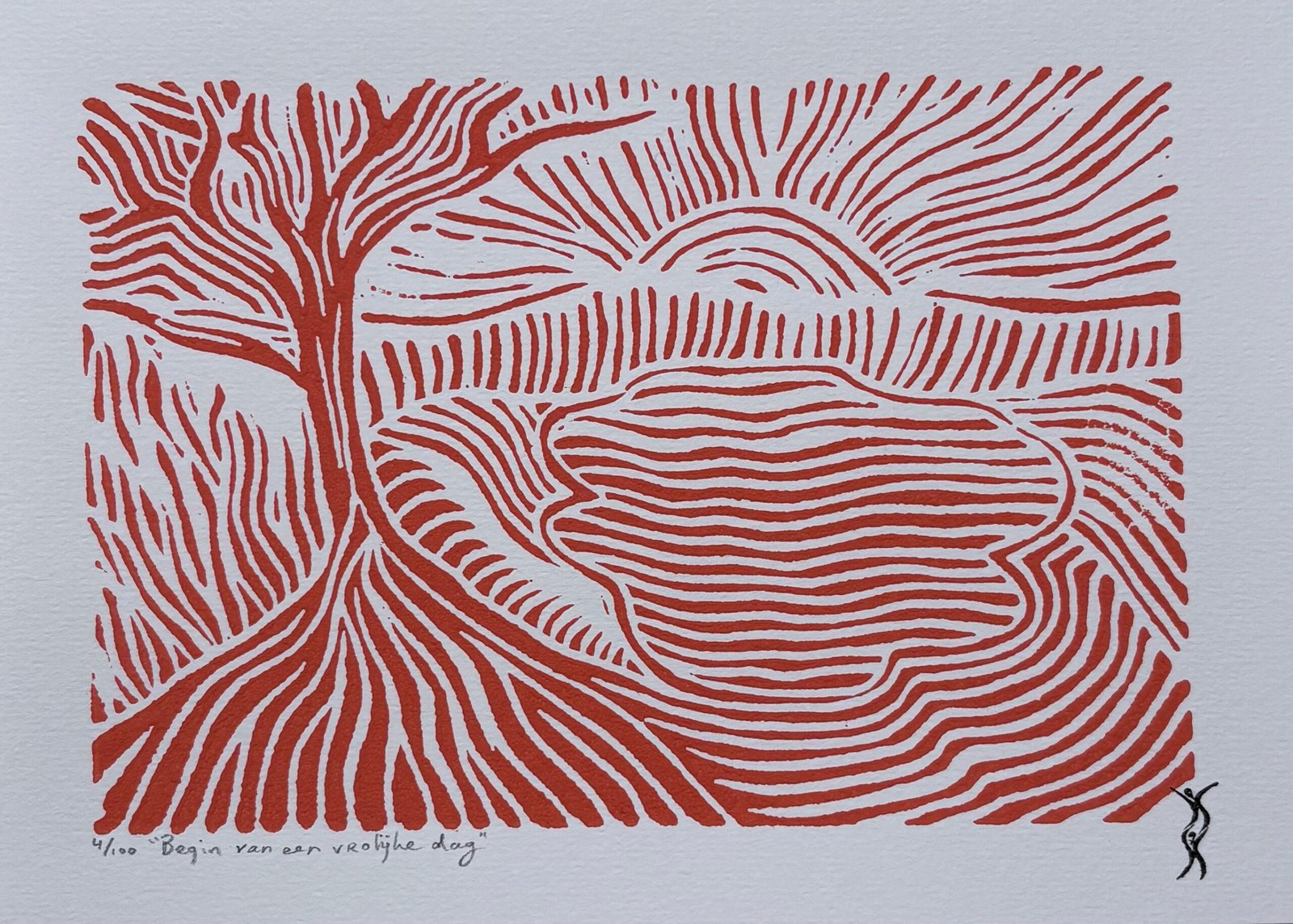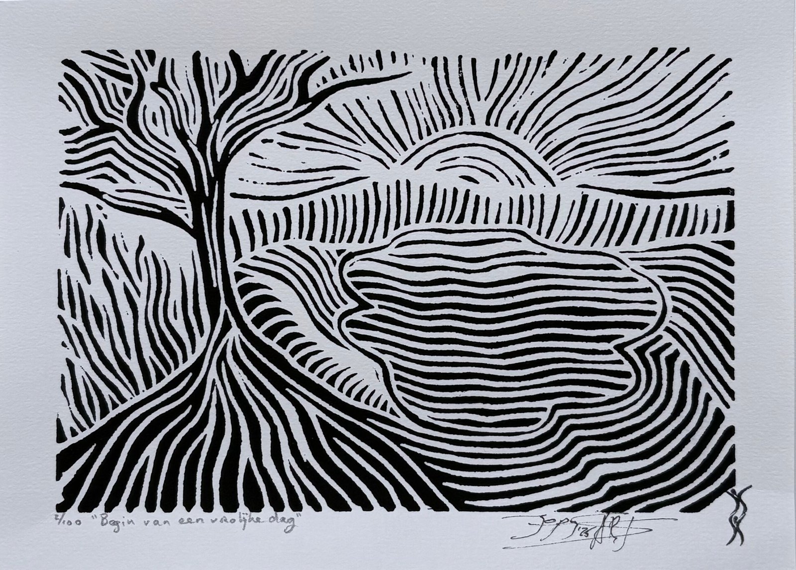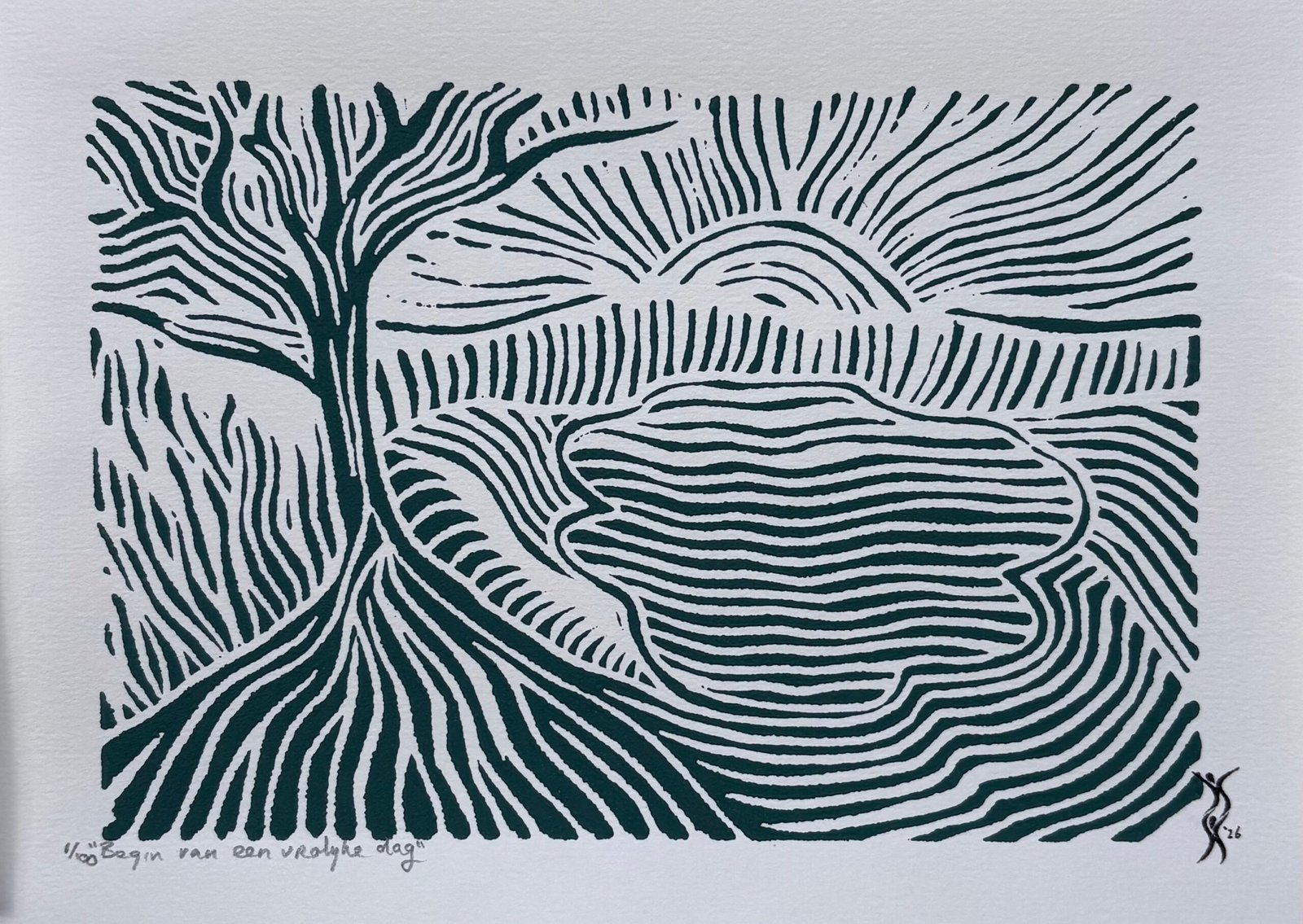 Elke print heeft rechts onderaan een stempel met mijn logo en het jaartal van de druk. Linksonder vermeld ik de titel en het oplagenummer in potlood. Op de achterkant staat mijn logo plus signatuur (bij drukken gemaakt vóór 2026 staat mijn signatuur met jaartal links onderaan de print).