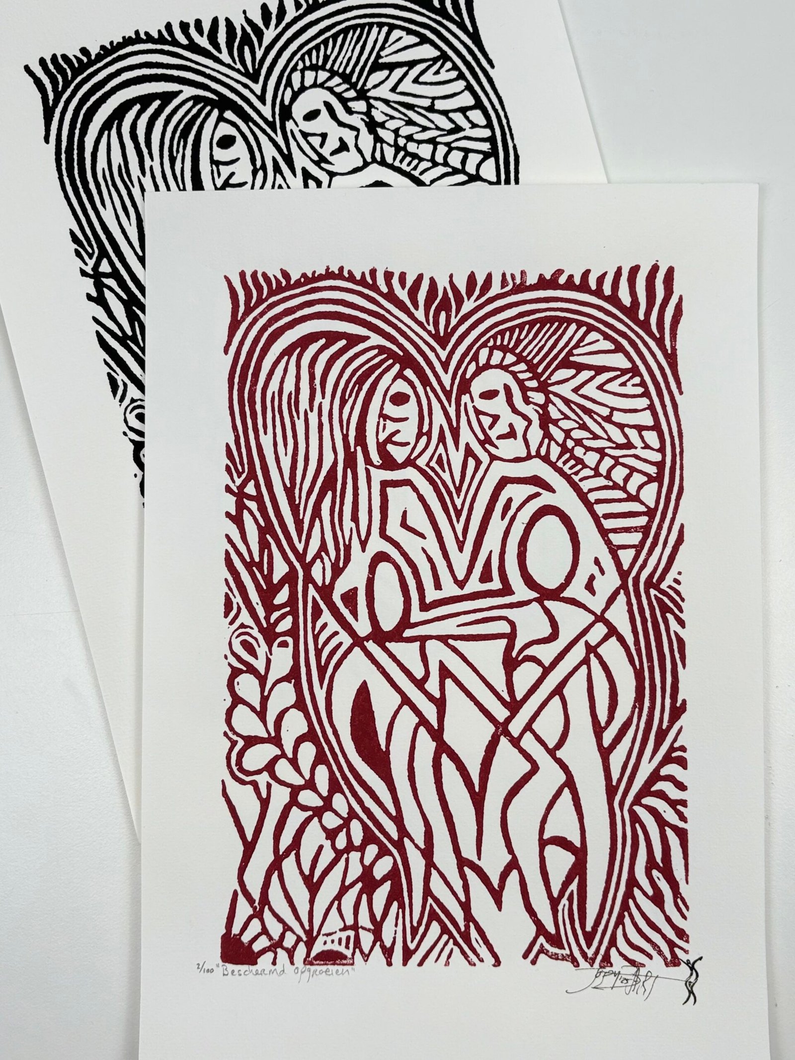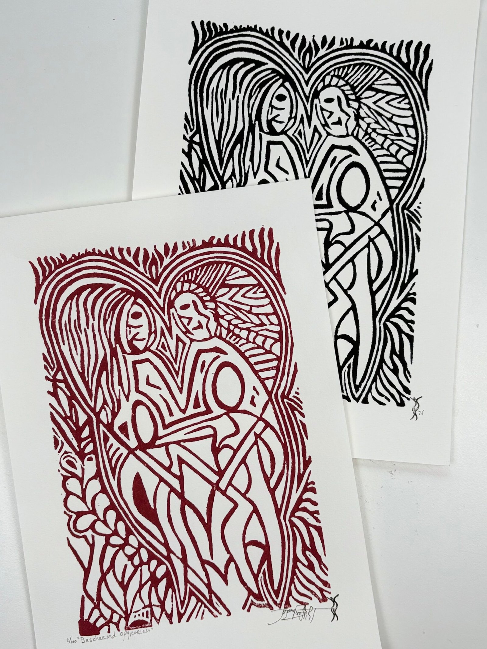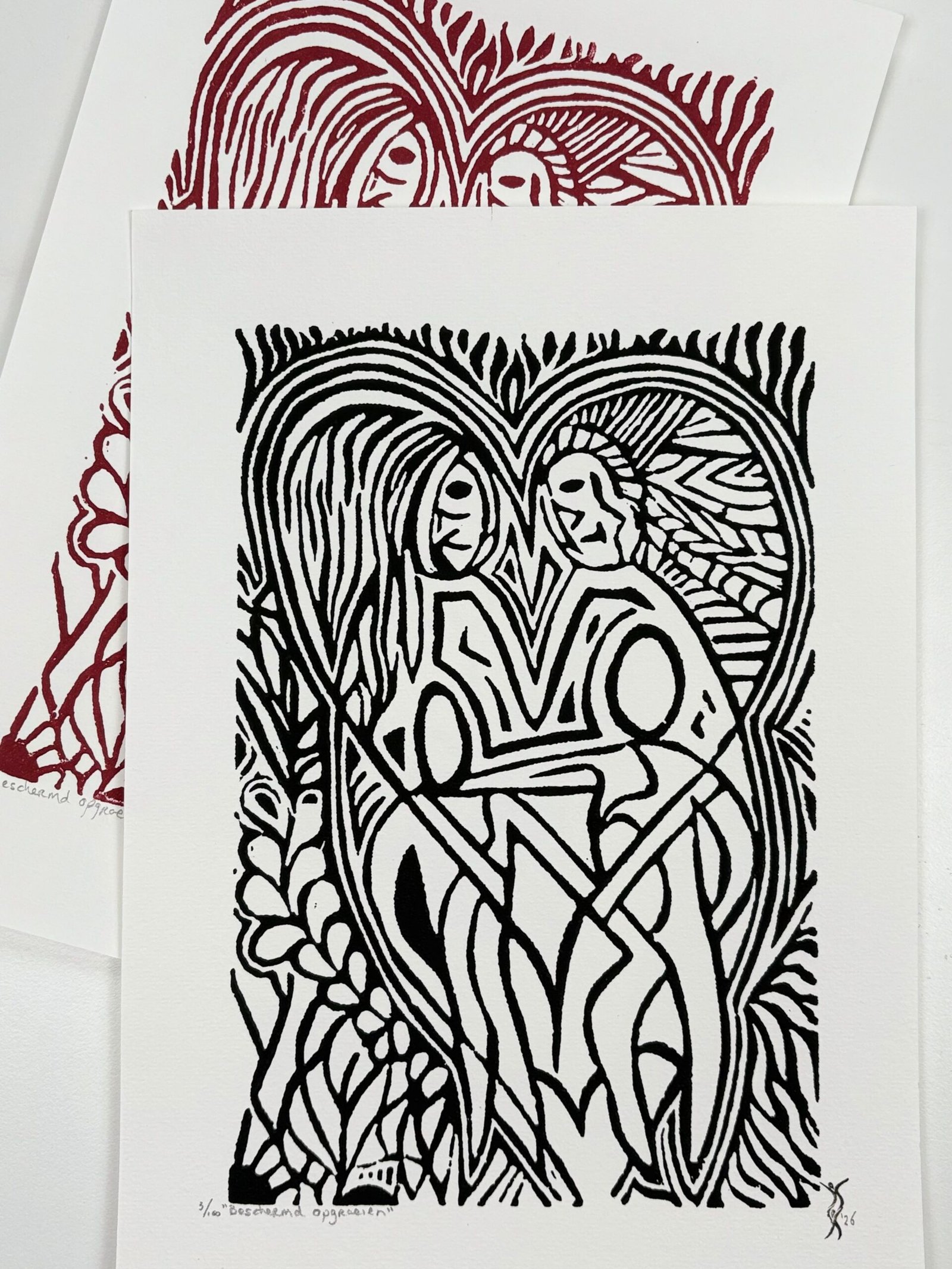 Elke print heeft rechts onderaan een stempel met mijn logo en het jaartal van de druk. Linksonder vermeld ik de titel en het oplagenummer in potlood. Op de achterkant staat mijn logo plus signatuur (bij drukken gemaakt vóór 2026 staat mijn signatuur met jaartal links onderaan de print).