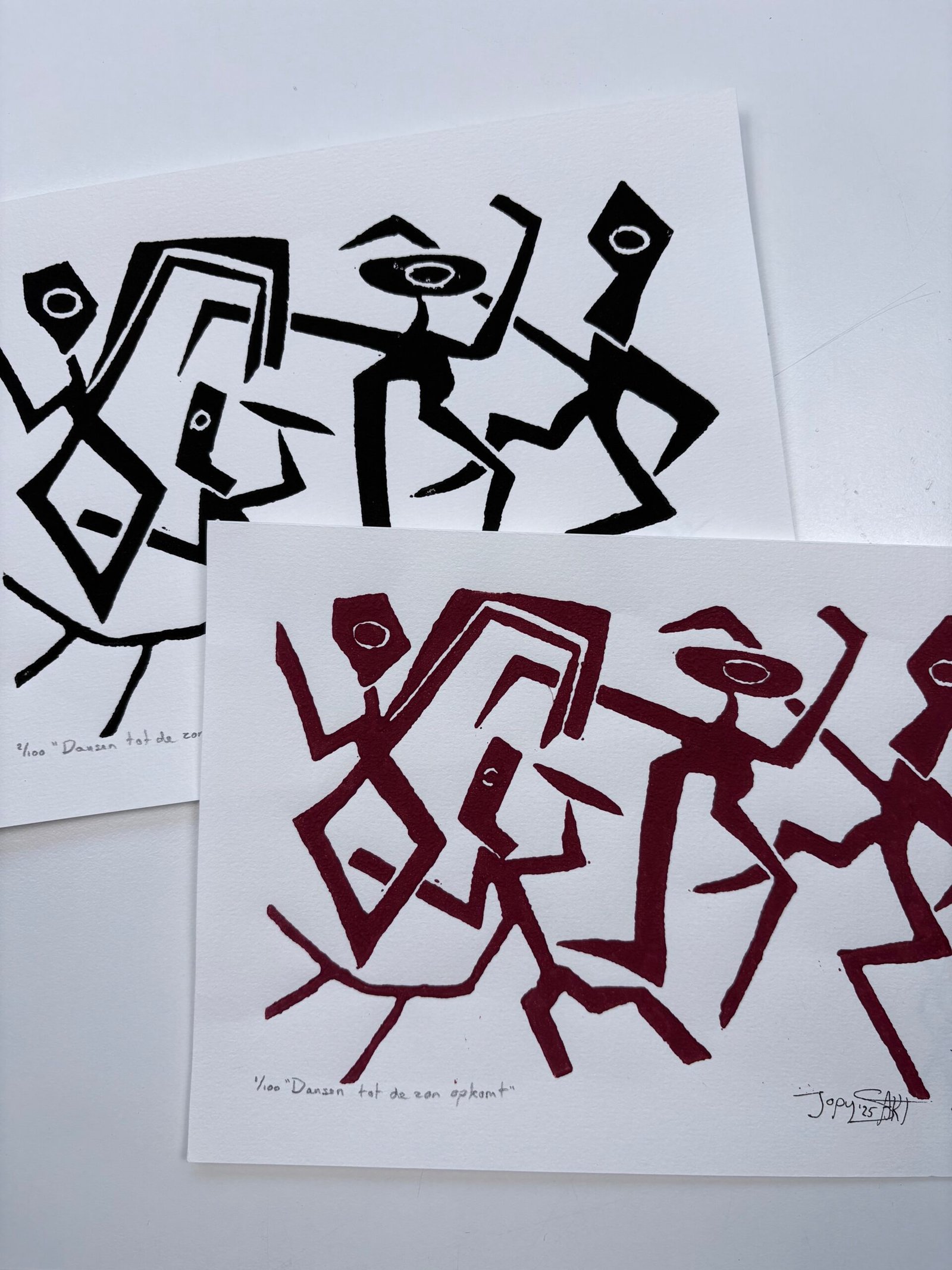 Elke print is handgedrukt. Hierdoor kunnen de prints onderling iets van elkaar verschillen. Dit hoort bij het drukken met de hand en maakt iedere linoprint uniek. Het geeft de print een eigen karakter.