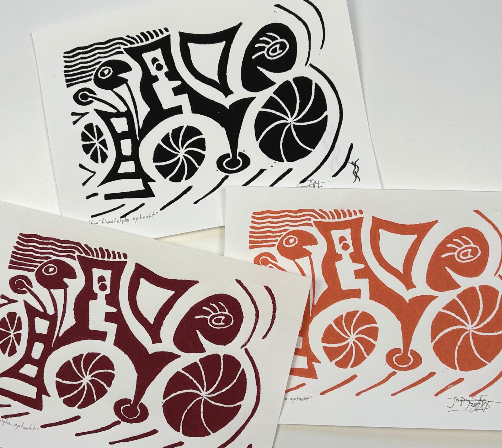 Elke print is handgedrukt. Hierdoor kunnen de prints onderling iets van elkaar verschillen. Dit hoort bij het drukken met de hand en maakt iedere linoprint uniek. Het geeft de print een eigen karakter.