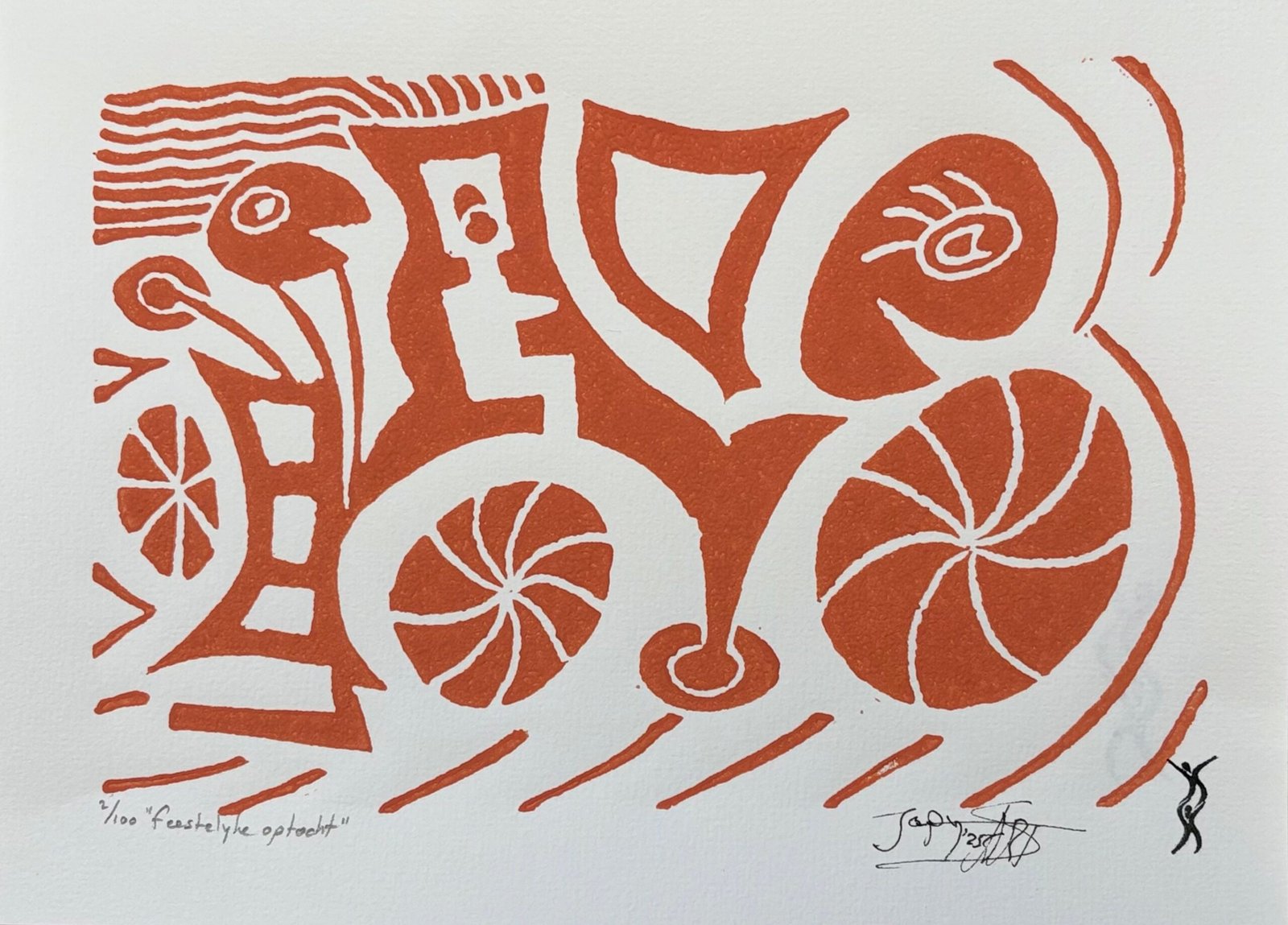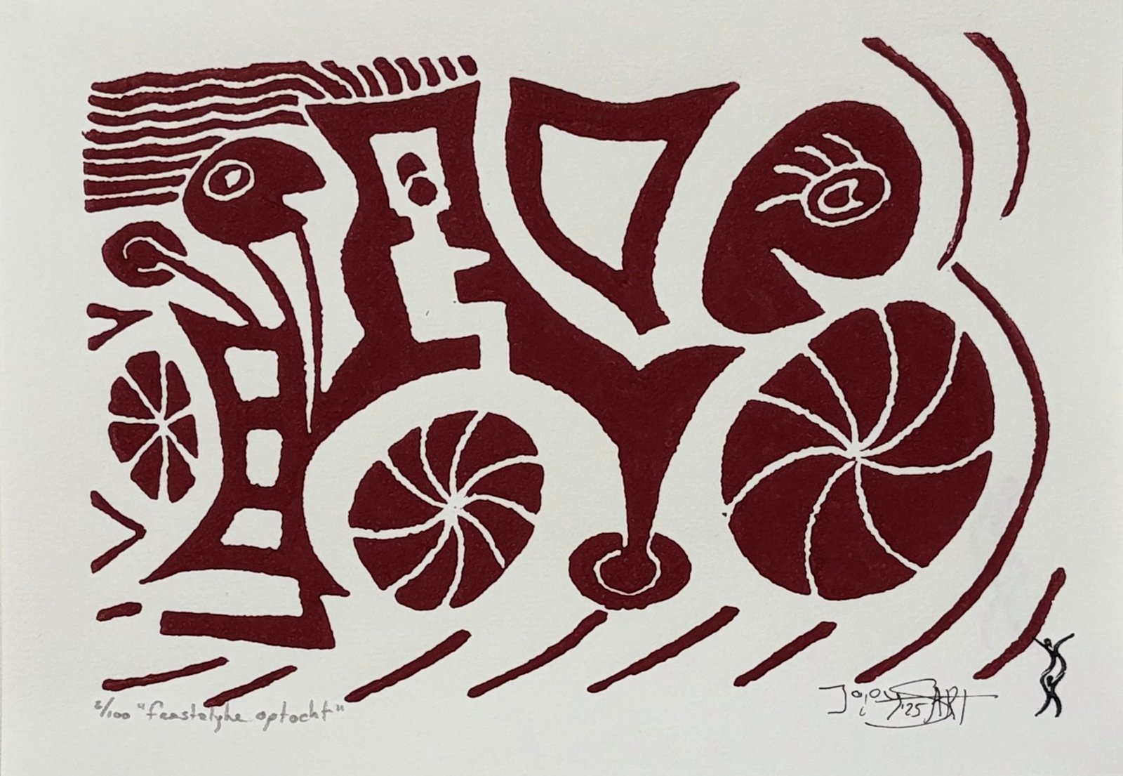 Deze print maakte ik in een vrolijke bui. Ik koos hier voor een abstracte weergave van een optocht. Het is ook maar net wat je erin ziet. Misschien zie je er ook wel een cocktailbar in zoals mijn buurvrouw of misschien wel iets totaal anders.