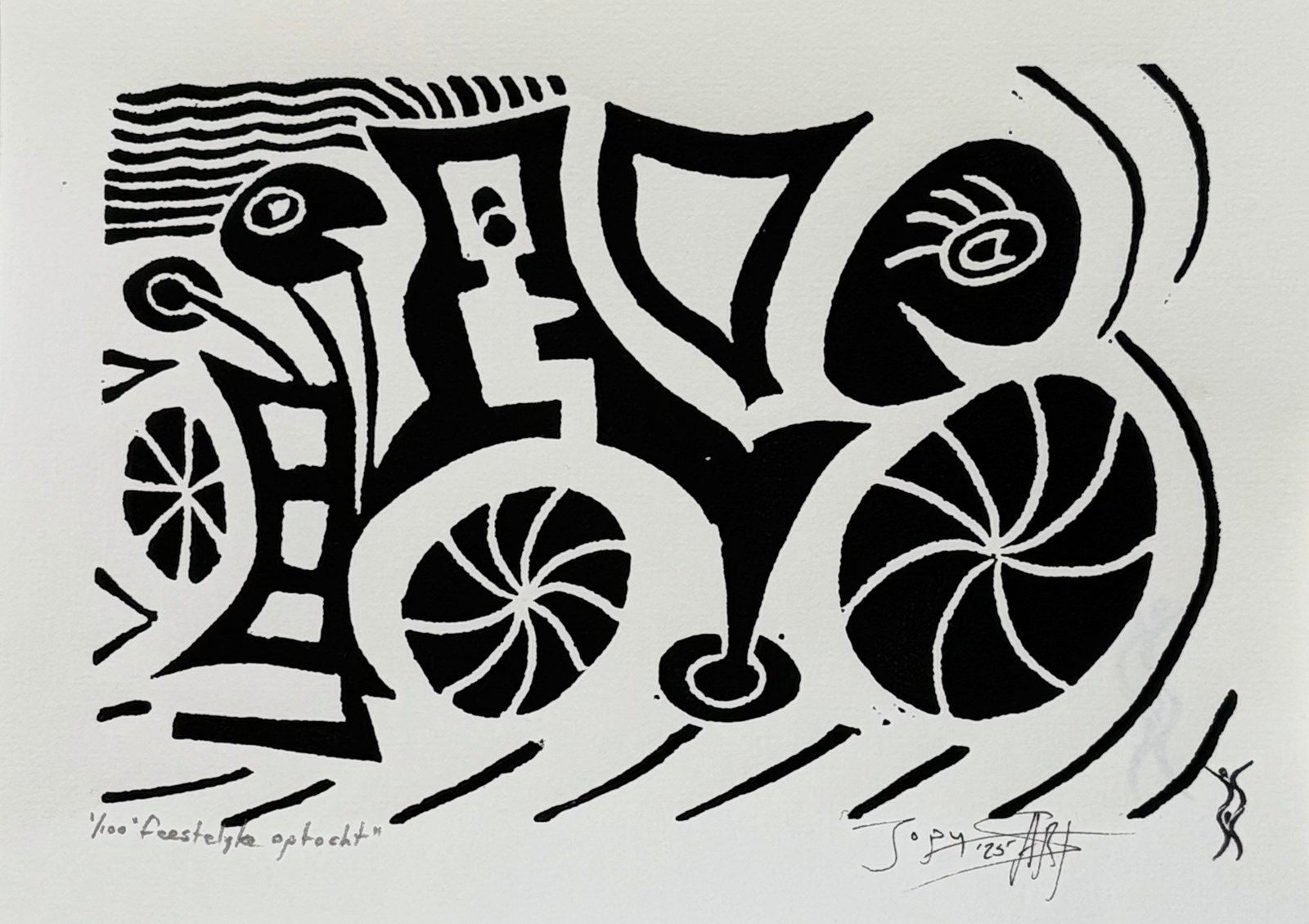 Elke print heeft rechts onderaan een stempel met mijn logo en het jaartal van de druk. Linksonder vermeld ik de titel en het oplagenummer in potlood. Op de achterkant staat mijn logo plus signatuur (bij drukken gemaakt vóór 2026 staat mijn signatuur met jaartal links onderaan de print).