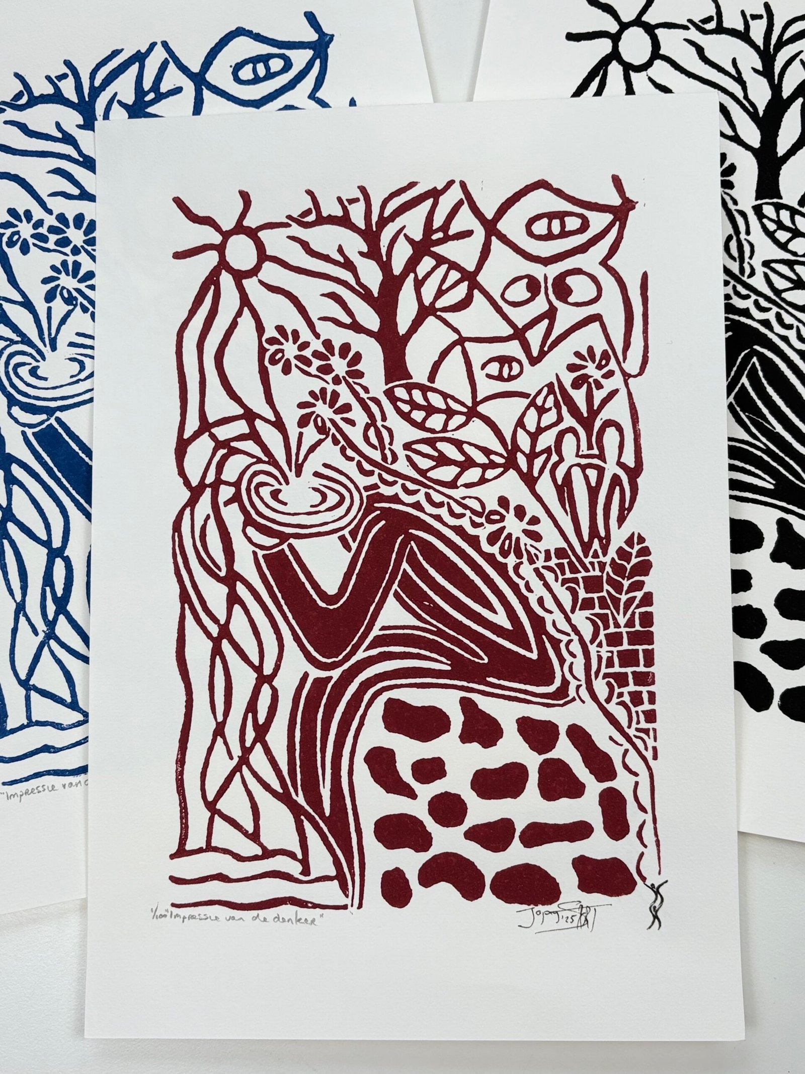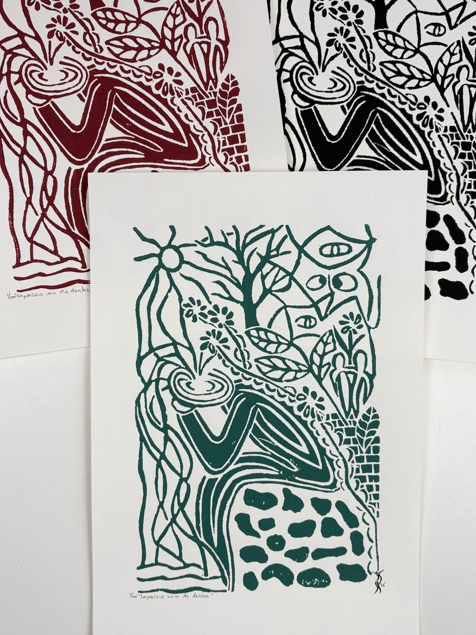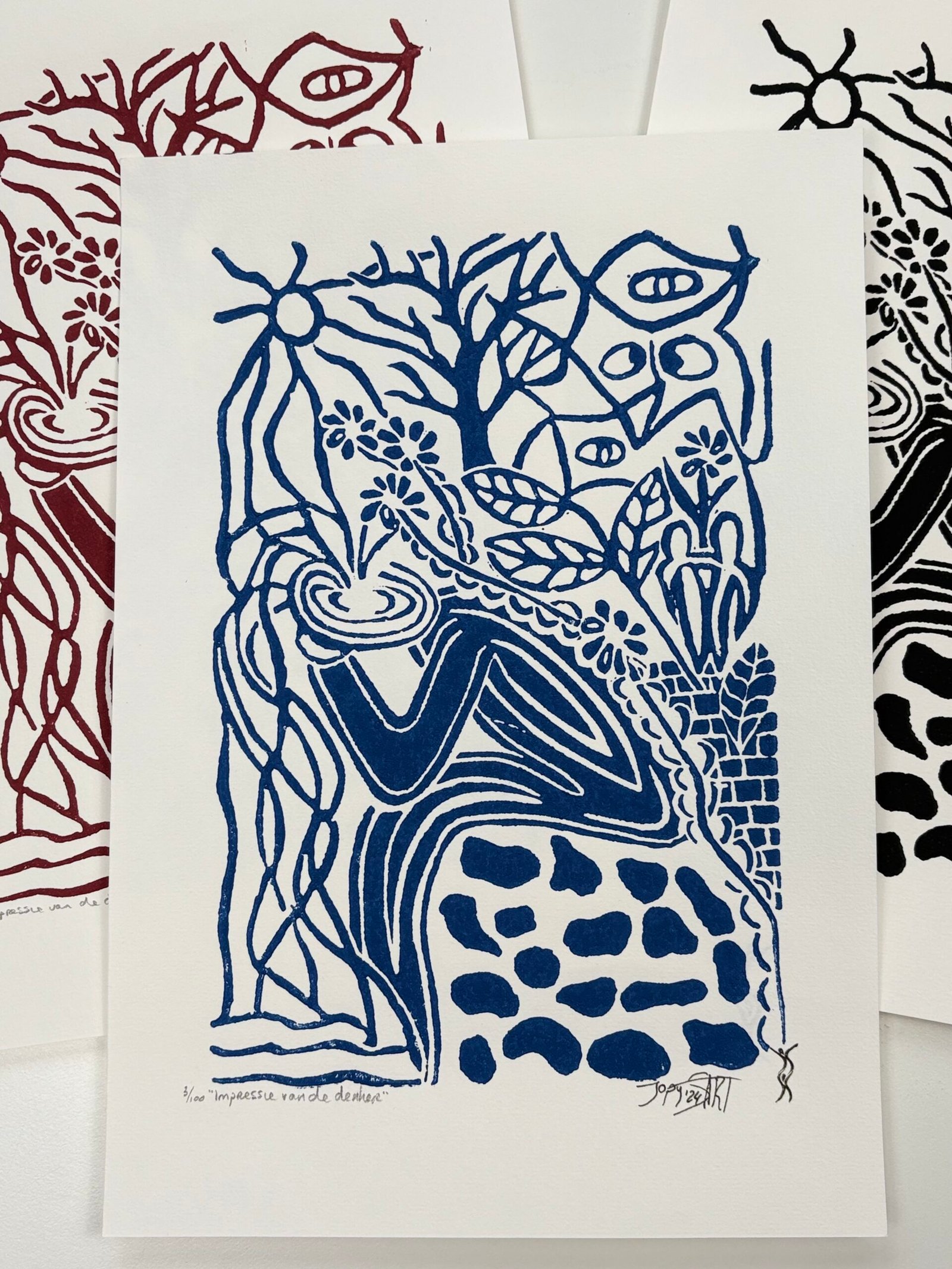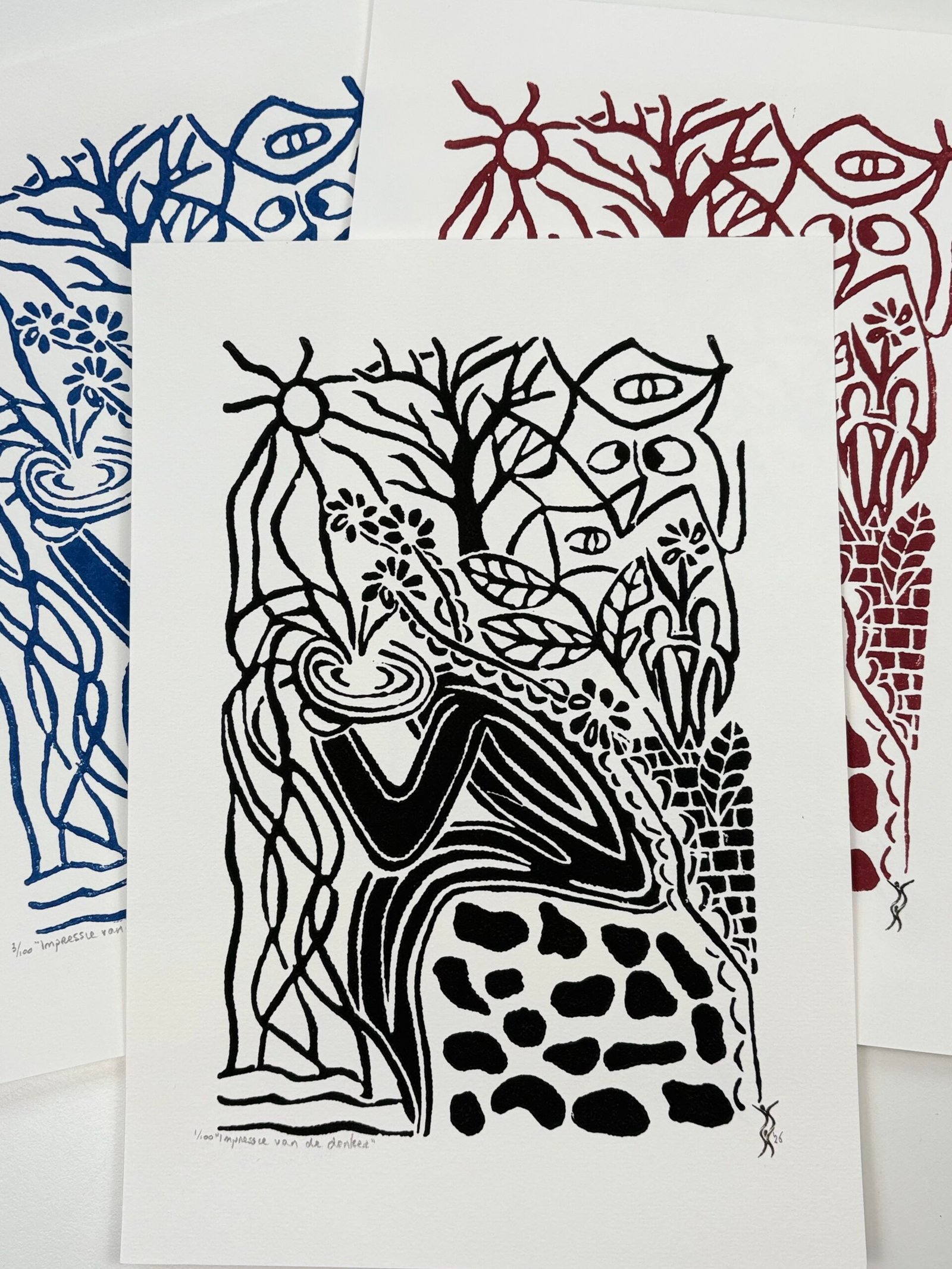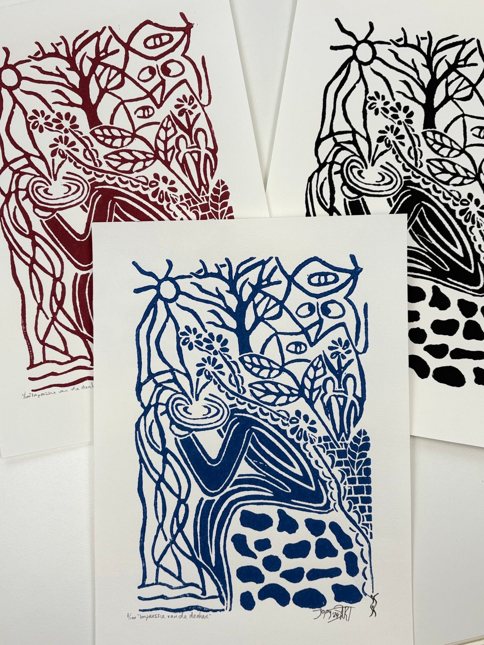 Elke print is handgedrukt. Hierdoor kunnen de prints onderling iets van elkaar verschillen. Dit hoort bij het drukken met de hand en maakt iedere linoprint uniek. Het geeft de print een eigen karakter.