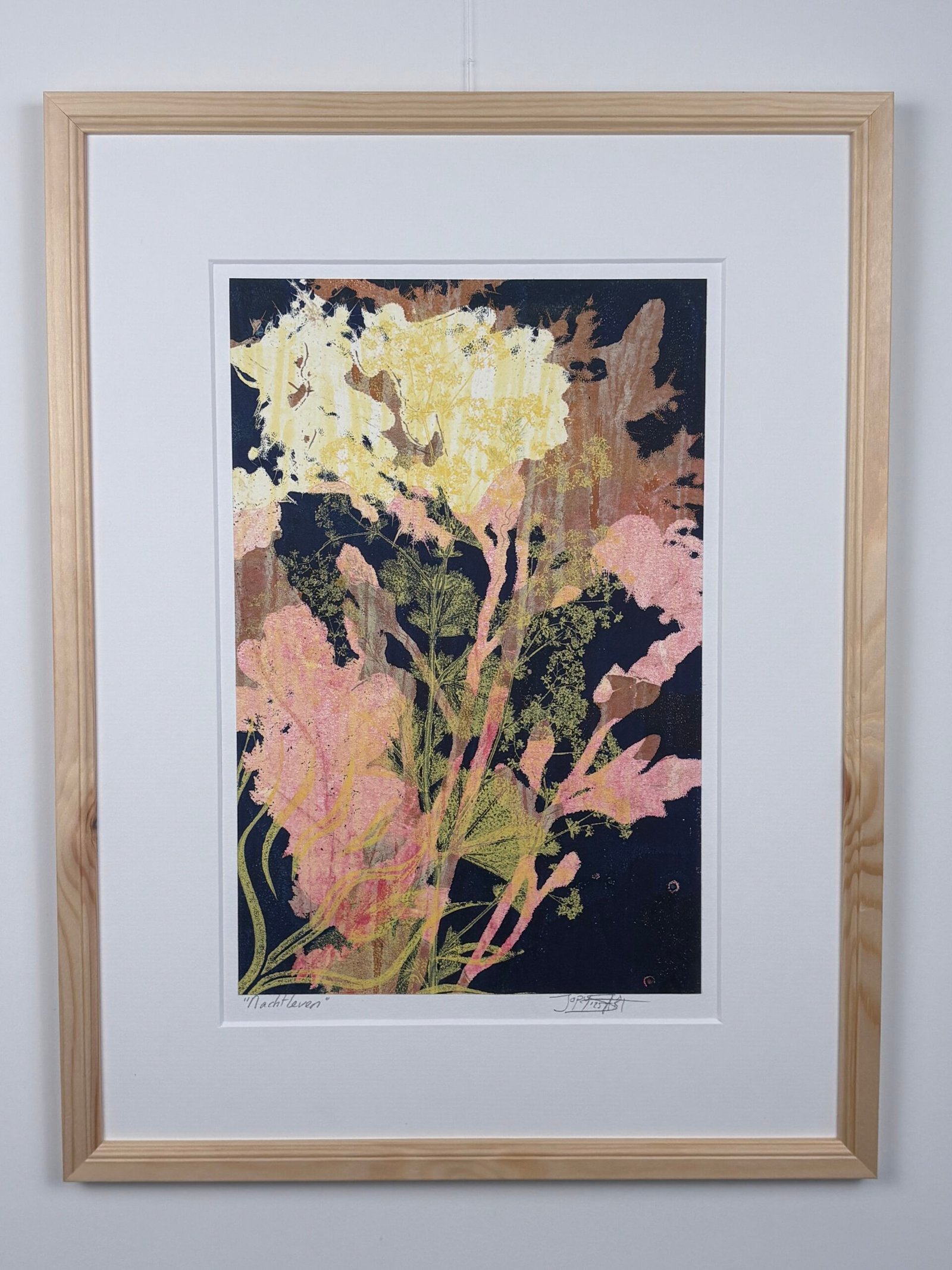 Deze monoprint geeft een mooi beeld van het bruisende leven dat zich in de nacht af kan spelen.