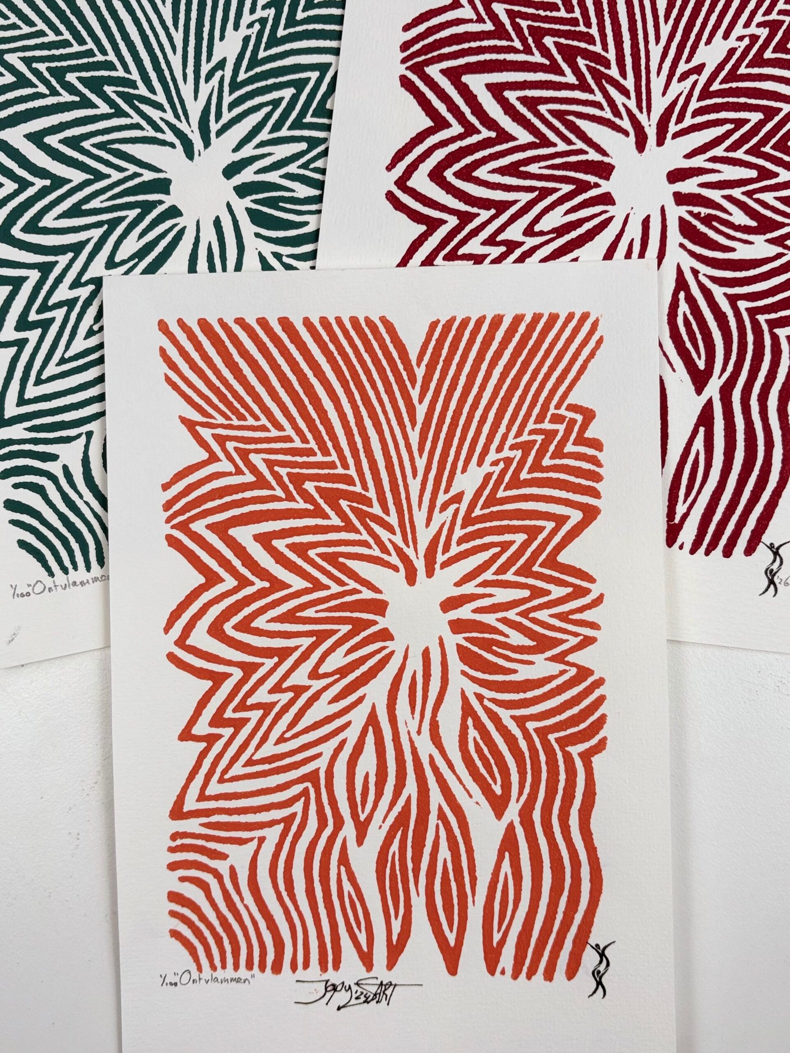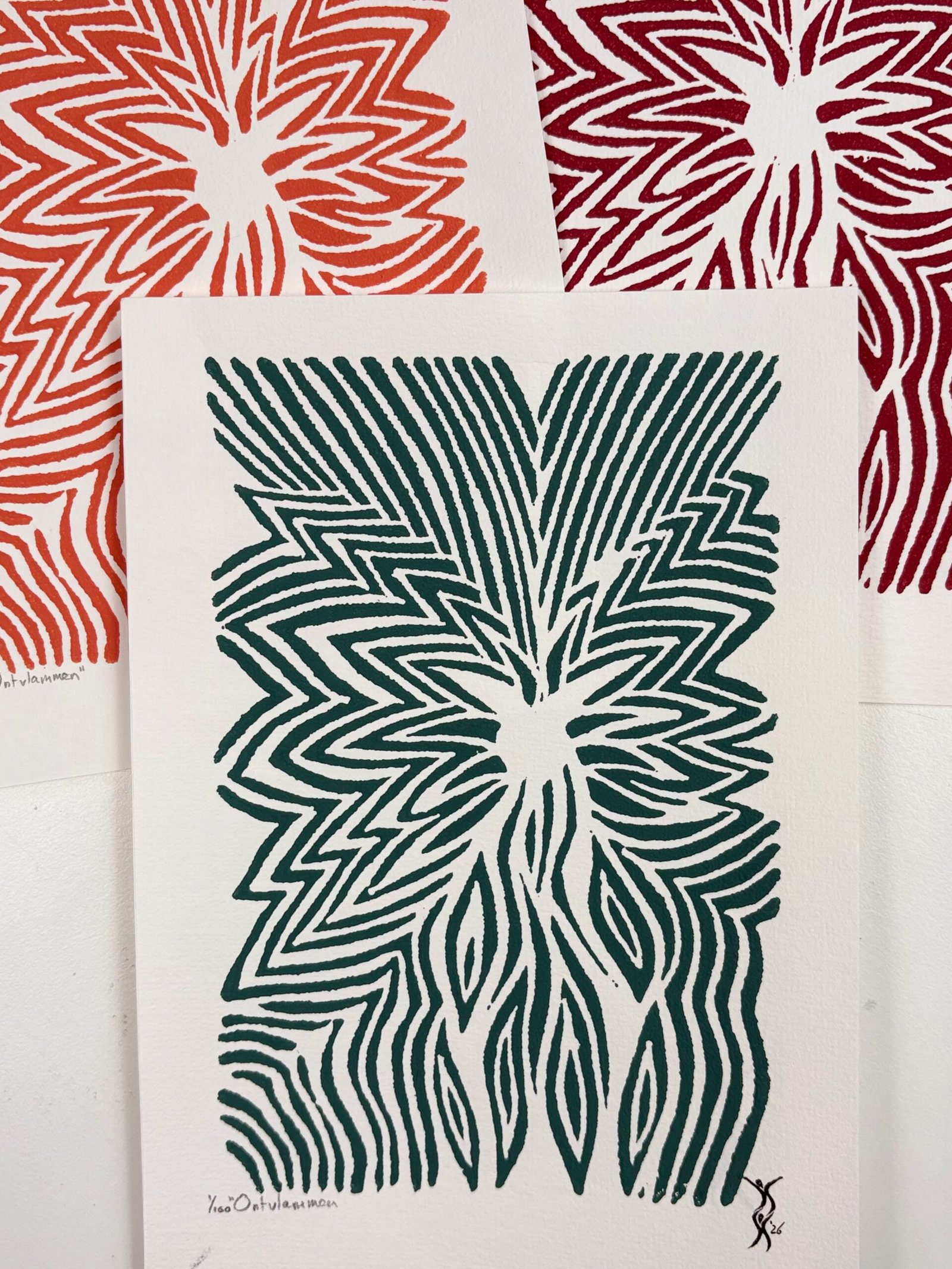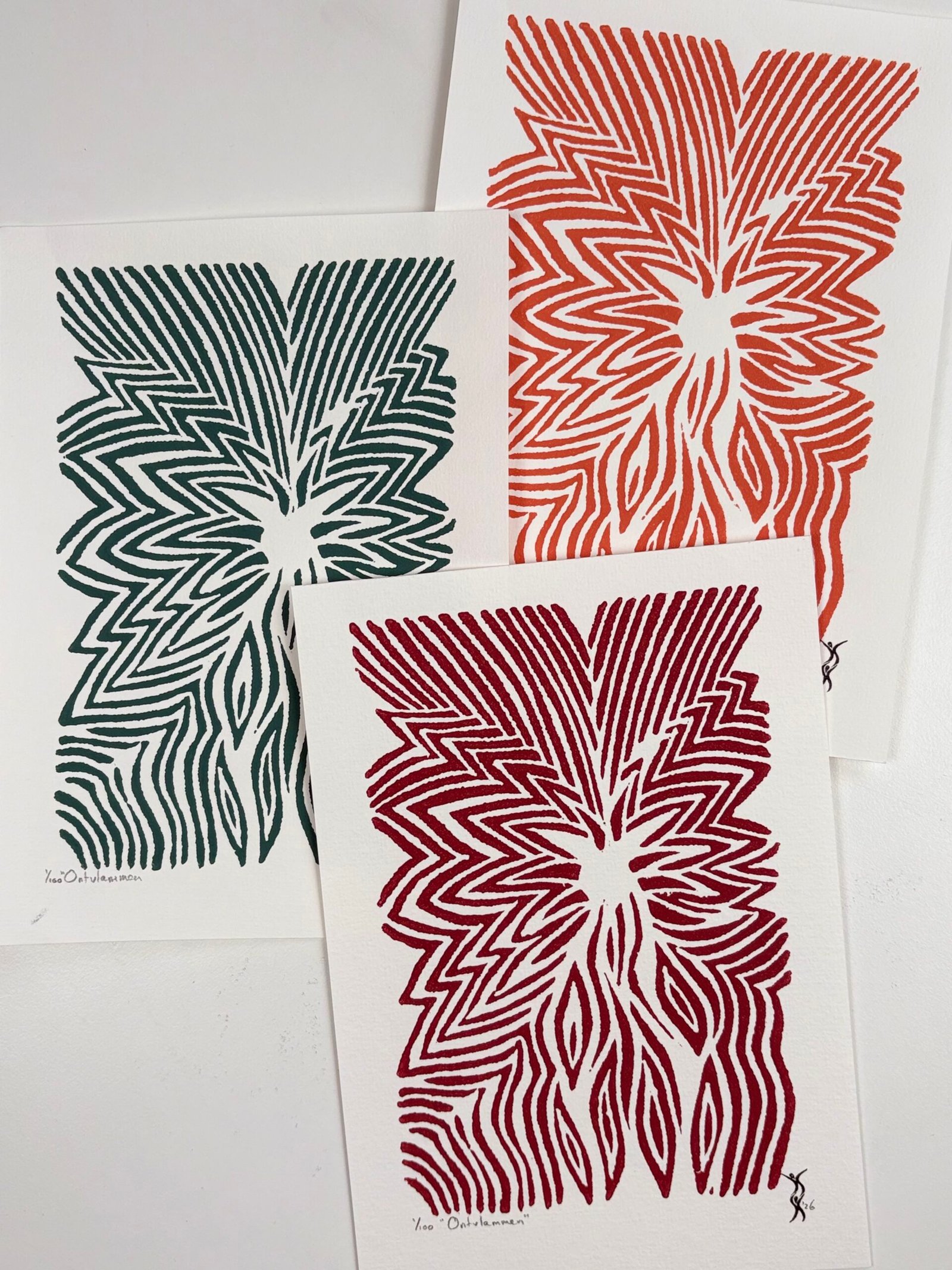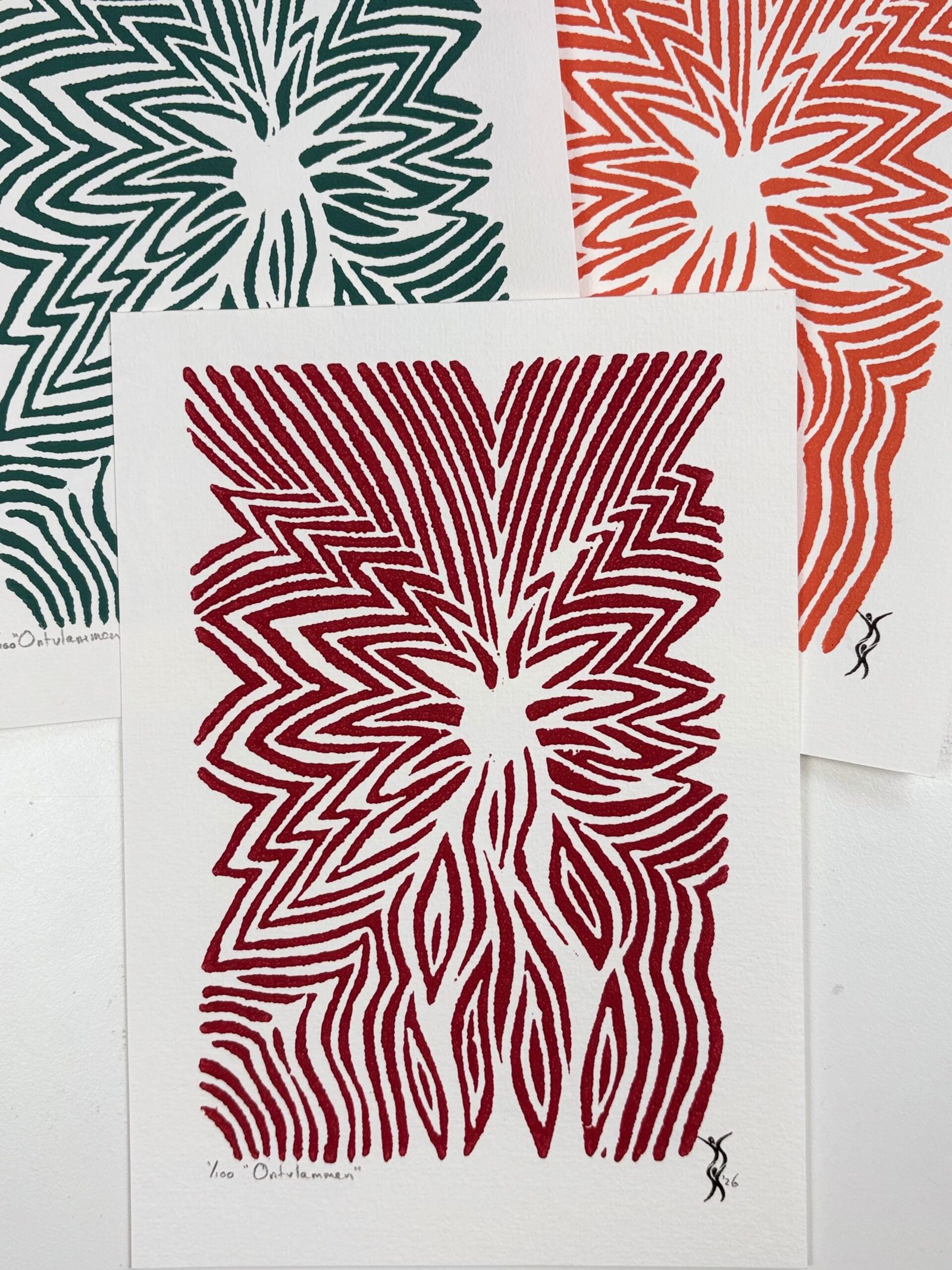 Elke print is handgedrukt. Hierdoor kunnen de prints onderling iets van elkaar verschillen. Dit hoort bij het drukken met de hand en maakt iedere linoprint uniek. Het geeft de print een eigen karakter.
