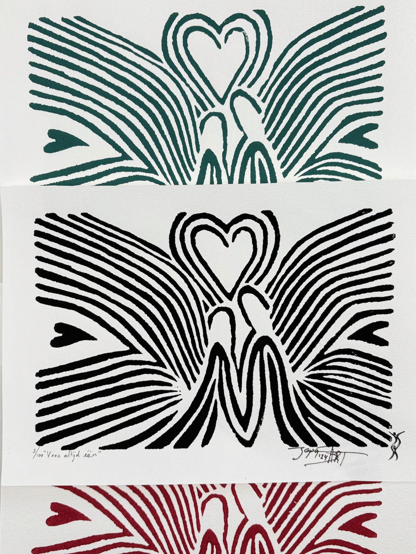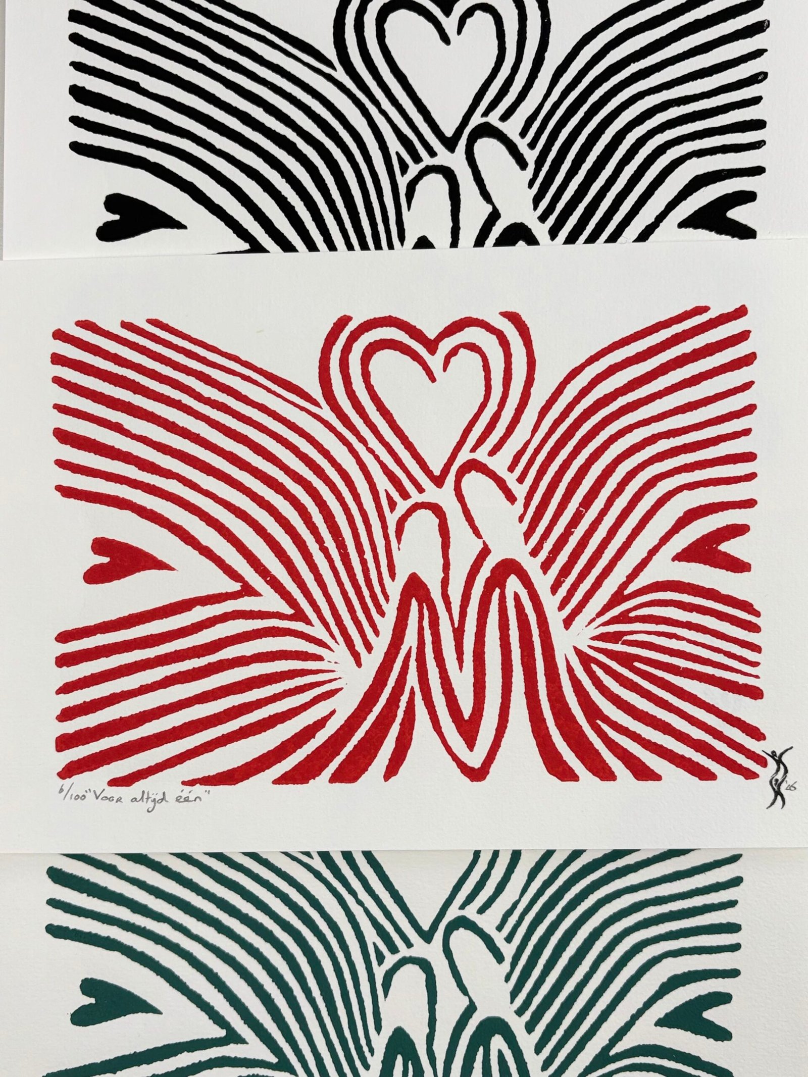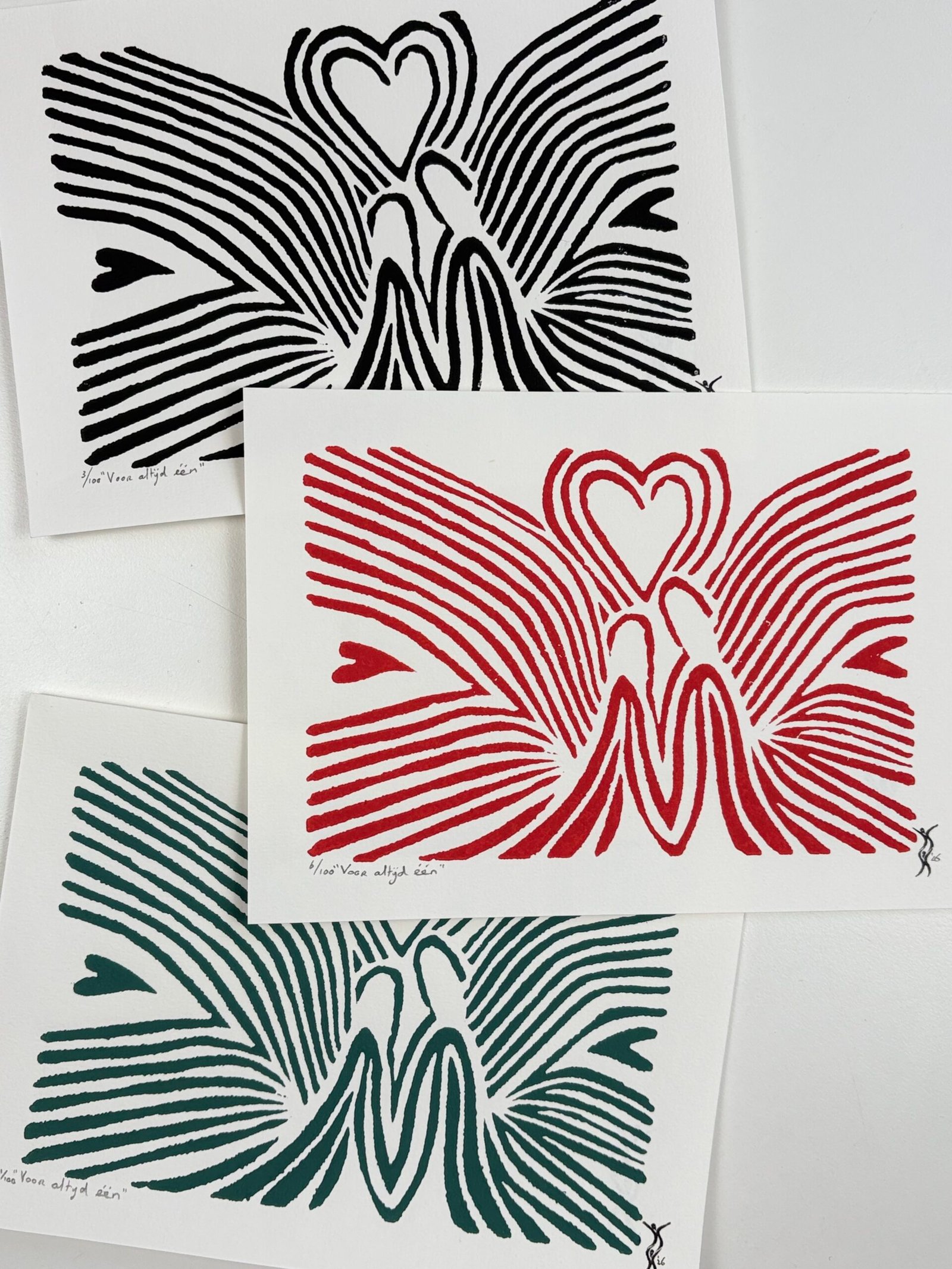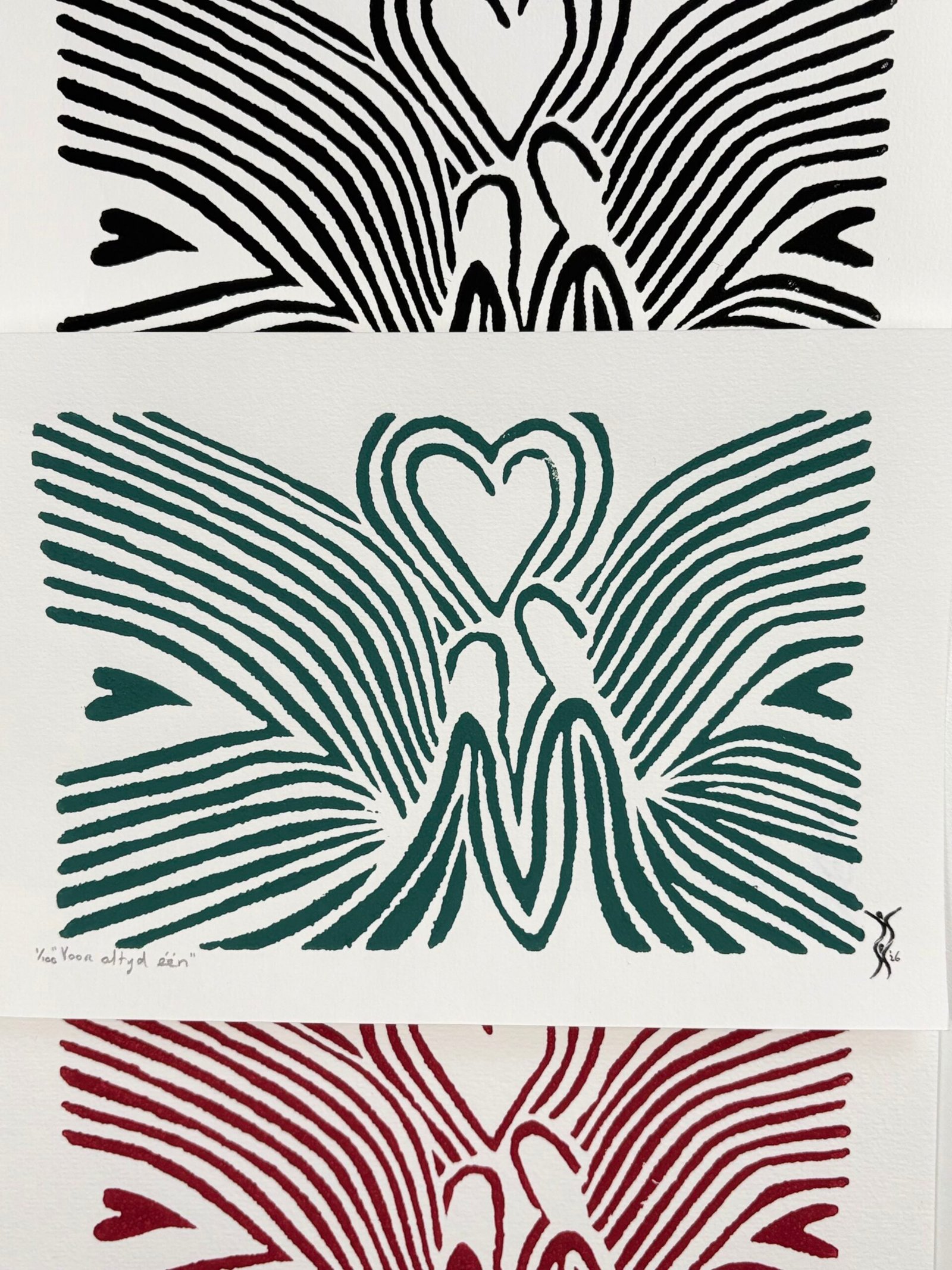 Elke print is handgedrukt. Hierdoor kunnen de prints onderling iets van elkaar verschillen. Dit hoort bij het drukken met de hand en maakt iedere linoprint uniek. Het geeft de print een eigen karakter.