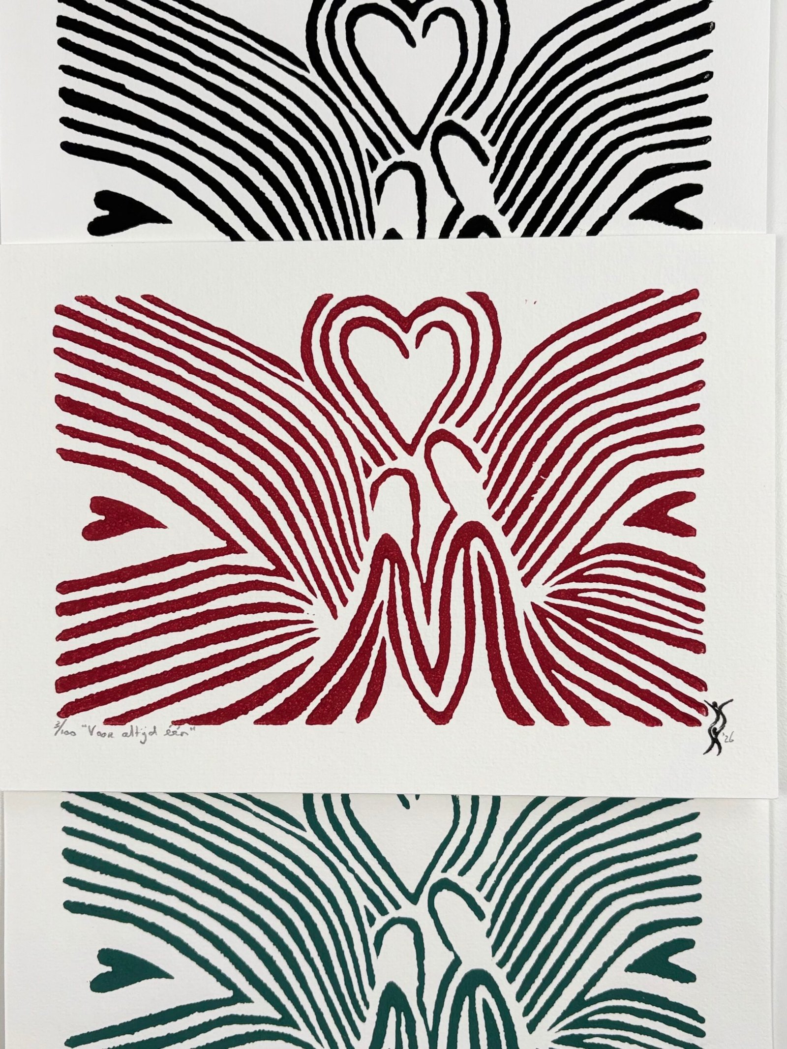 Elke print heeft rechts onderaan een stempel met mijn logo en het jaartal van de druk. Linksonder vermeld ik de titel en het oplagenummer in potlood. Op de achterkant staat mijn logo plus signatuur (bij drukken gemaakt vóór 2026 staat mijn signatuur met jaartal links onderaan de print).